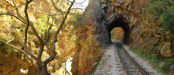 Αυτό το απροσπέλαστο μέρος το «δάμασε» με απόλυτο σεβασμό στη μοναδικότητά του, η τεχνολογία στις 10 Μαρτίου του 1896, όταν άρχισε το ταξίδι του ο οδοντωτός σιδηρόδρομος.Την κατασκευή του αποφάσισε ο Χαρίλαος Τρικούπης το 1889 οπότε και άρχισε να κατασκευάζεται το έργο και το κόστος του έφτασε τα 3.900.000 χρυσές δραχμές. Το τρενάκι συνεχίζει το ταξίδι του στο χρόνο χαρίζοντας υπέροχες στιγμές στους επιβάτες ξεκινώντας από το Διακοπτό και περνώντας από κροκαλοπαγή πετρώματα που προκαλούν ρίγη και δέος, μέσα από γέφυρες και σήραγγες αλλά και από μέρη όπου η γαλήνη απλώνεται κάτω από το αργόσυρτο αγκομαχητό του οδοντωτού. Τα στενότερα και ωραιότερα σημεία του φαραγγιού είναι στις θέσεις Νιάματα, Πόρτες, Τρικλιά, Σιφώνι και το «δικαστήριο», μια σπηλιά με σταλαγμιτικούς βράχους που μοιάζουν με αίθουσα δικαστηρίου. Ποτέ στη διάρκεια λειτουργίας του Οδοντωτού δεν έχει σημειωθεί ατύχημα.