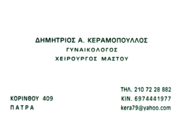 customer tabsΕπικοινωνίαΜαιευτήρας - Γυναικολόγος - Χειρουργός ΜαστούΠάτρα Δέχεται κάθε Παρασκευή με ΡαντεβούΚολωνάκι Δέχεται καθημερινά με ραντεβού2ο Ιατρείο:Ρηγίλλης 8, Κολωνάκι, Αθήνα τηλ:2107228882Μαιευτήρες - ΓυναικολόγοιΥγείαΧειρουργοί ΜαστούΚορίνθου 409, ΠάτραΠΑΤΡΑ ΑΧΑΪΑΣΑΧΑΪΑΠΕΛΟΠΟΝΝΗΣΟΣ 2610313313 2107228882 69744419772107236474kera79@yahoo.com Το προτείνω (έχει προταθεί 1 φορές) ΦωτογραφίεςFacebook LikeShare on FacebookTweet Widget