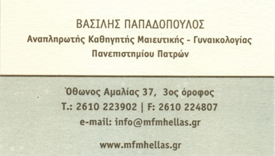 Ο Παπαδόπουλος Βασίλειος, γυναικολόγος - μαιευτήρας, είναι επιστημονικός υπεύθυνος του ΚΕΝΤΡΟΥ ΕΜΒΡΥΟΜΗΤΡΙΚΗΣ ΙΑΤΡΙΚΗΣ - ΠΑΠΑΔΟΠΟΥΛΟΣ ΒΑΣΙΛΕΙΟΣ στην Πάτρα.